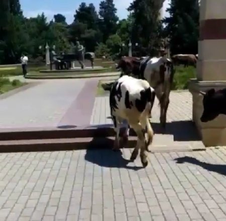 Şəmkir İcra Hakimiyyətinin yanında inəklər otlayır – “İstiqlal” parkında biabırçı mənzərə