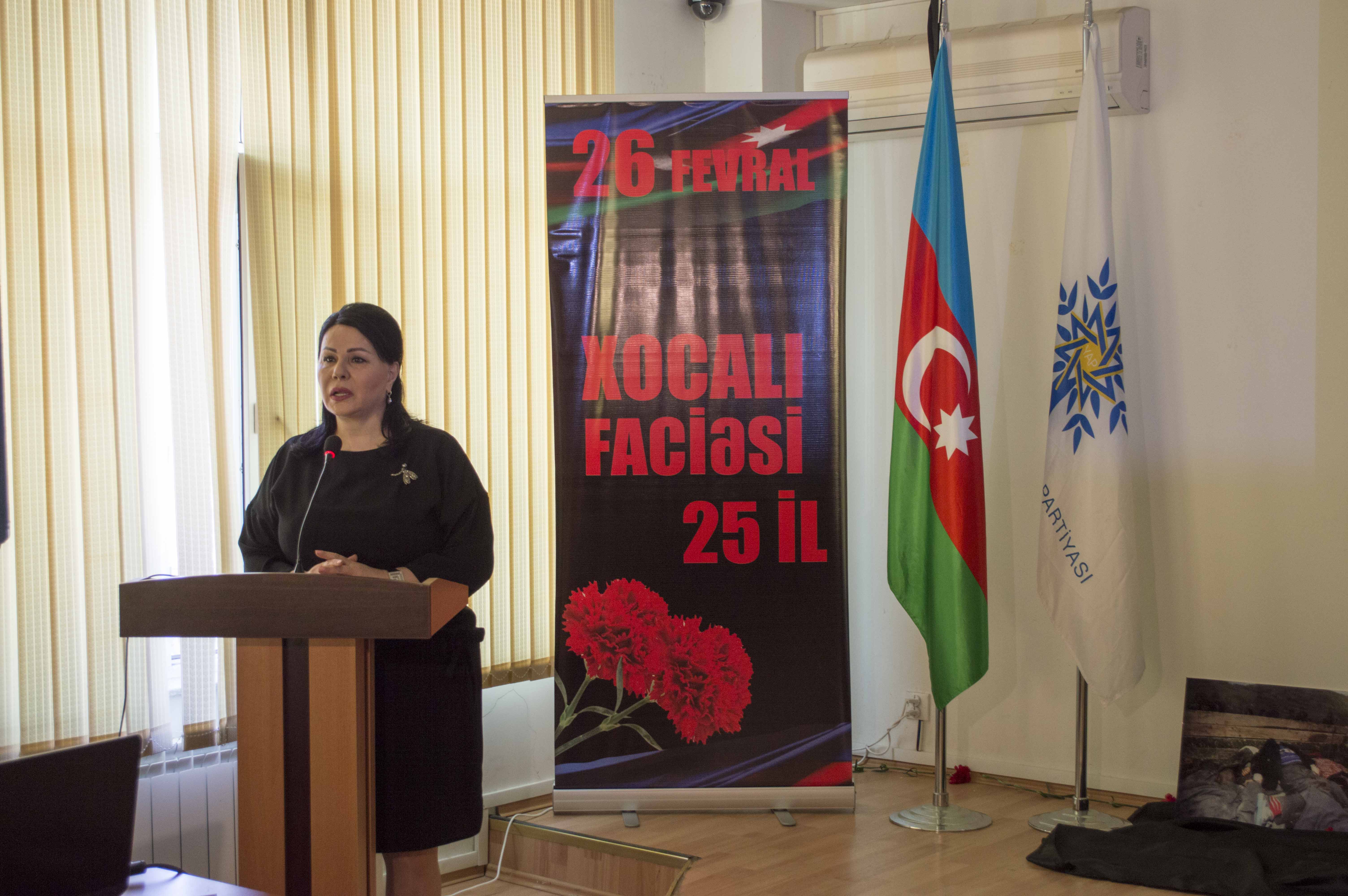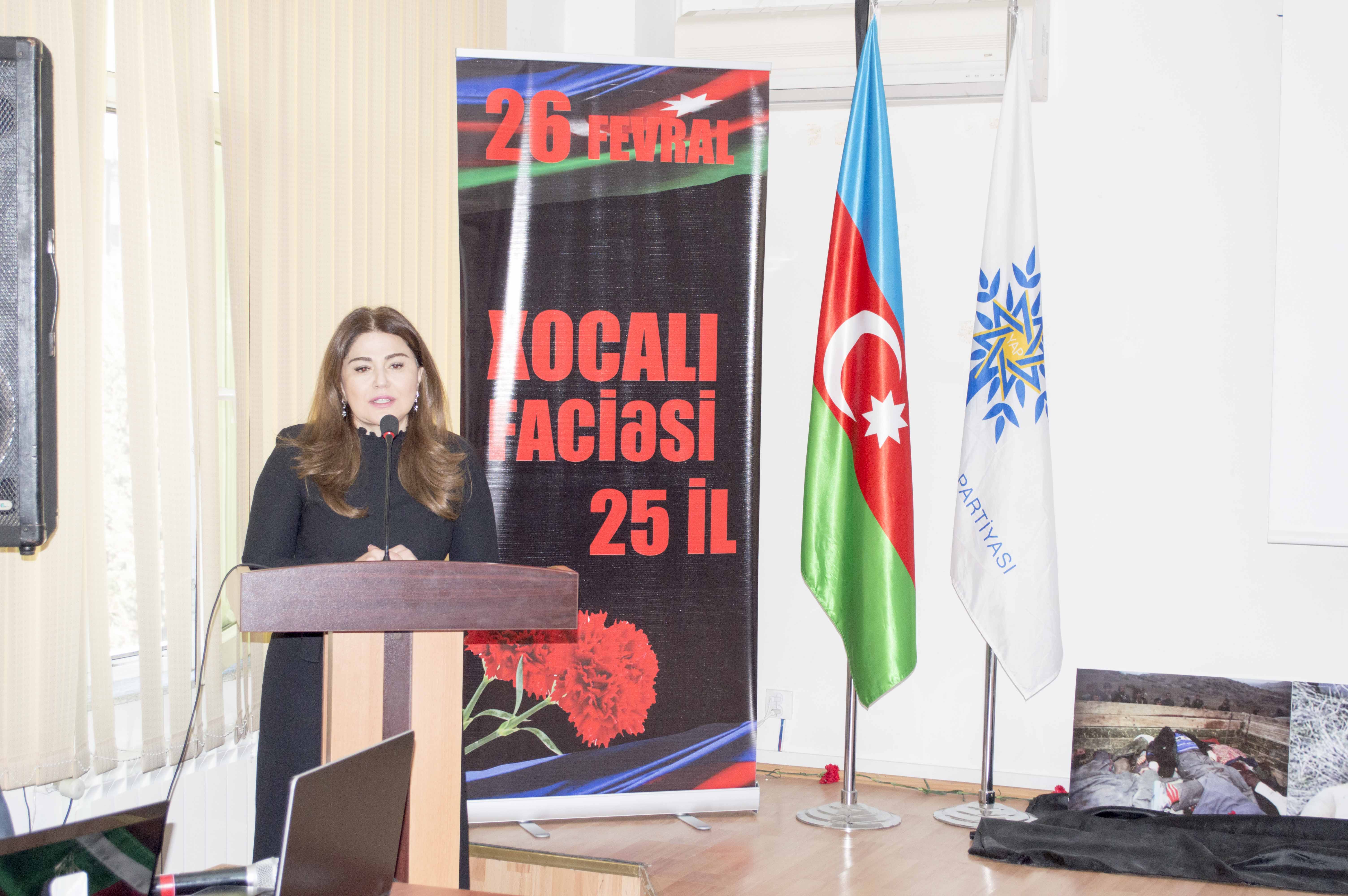 Tədbiri giriş sözü ilə açan YAP Nərimanov rayon təşkilatı Qadınlar Şurasının sədri Məhəbbət İbrahimova Xocalı faciəsinin başvermə səbəbləri haqqında ətraflı məlumat verərək bildirmişdir ki, həmin gecə erməni cəlladları və onların havadarlarının Xocalıda törətdikləri qırğınlar 20-ci əsrin ən qanlı faciələrindən biri kimi tarixə düşmüşdür.