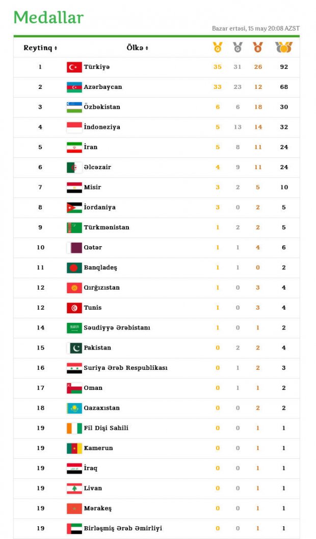Cəmi Azərbaycanın aktivində 33 qızıl, 23 gümüş və 12 bürünc medal var. Türkiyyə 35 qızıl, 31 gümüş və 26 bürünc medalla birinci pillədə qərarlaşıb. Üçüncü yeri isə 6 qızıl, 6 gümüş və 18 bürünc medal ilə Özbəkistan tutur.![]()