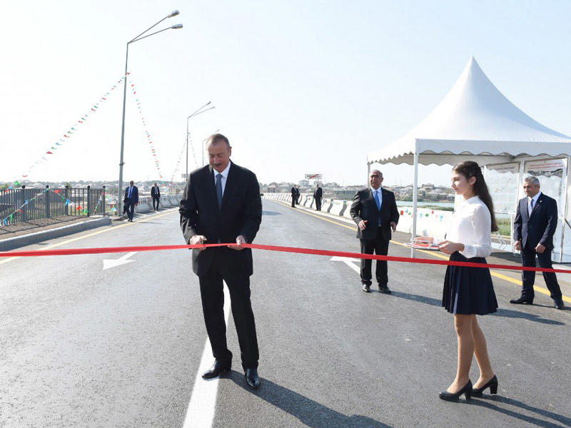 Dövlətimizin başçısı yeni yolun rəmzi açılışını bildirən lenti kəsdi.