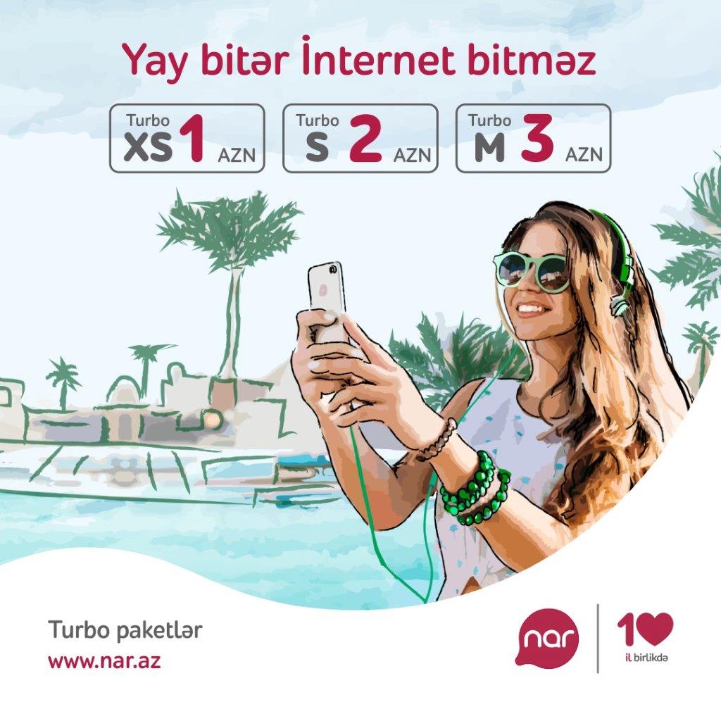 Abunəçilərin yay mövsümündə mobil internetdən daha rahat istifadəsini təmin etmək məqsədilə, “Nar” Turbo paketlərində interneti limitsiz etdi. İndi Turbo XS, Turbo S və Turbo M paketlərini əldə edən abunəçilər ölkənin hər yerində yüksək sürətli “Nar” internetindən yararlana bilər. Paket çərçivəsində təqdim olunan data trafik sərf olunarsa, paketin istifadə müddətinin sonuna qədər internet bağlantısı kəsilmir.