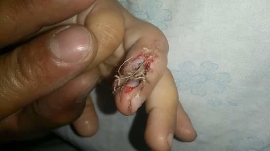 İddiaya görə, həmin həkim uşağın barmağına səliqəsiz bir şəkildə, narkozdan istifadə etmədən tikiş atıb. Bundan əlavə uşağın barmağının ətini də kəsib atıb:![]()