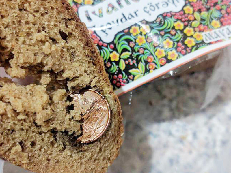 "İvanovka" şirkətinin istehsalı olan çörəyin içərisindən xırda pul (3 qəpik) çıxıb.
