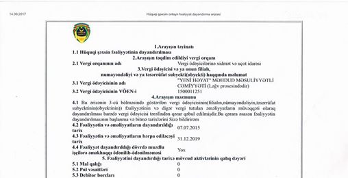 Müflis elan edilməsi barədə xəbər yayılmış Yeni Həyat MMC Zərifə Əliyeva 55 (binanın görüntüsü əlavə olunur) ünvanında yerləşən yaşayış binasının inşasını həyata keçirərək istismara təhvil vermişdir və 2015-ci il tarixindən etibarən rəsmi olaraq fəaliyyəti dayandırılmışdır (fəaliyyətin dayandırılması haqqında haqqında arayış əlavə olunur) və binaya xidmətin göstərilməsi üçün Hayat Management MMC-yə təhvil verilmişdir.