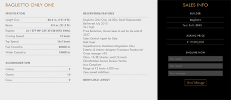 Məlumata görə, sözügedən yaxta A.Məmmədovun Londondakı şirkətinə aiddir. Bütöv adı "Baglietto Only One” adlanan yaxtanın satış elanı "M Blue Yacht”da yerləşdirilib. Yaxtada əyləncə, idman zalları olmaqla 5 otaq mövcuddur.