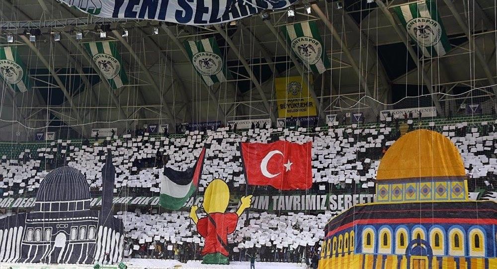 Rubrika.az Axar.az-a istinaden xəbər verir ki, Konya Böyükşəhər Bələdiyyə Stadionunda keçirilən yarışmada “Konyaspor” azarkeşləri ABŞ-ın Qüdslə bağlı verdiyi qərara etiraz olaraq möhtəşəm pankart hazırlayıblar. Azarkeşlər Türkiyə və Fələstin bayraqları ilə yanaşı, Əqsa məscidinin maketini əllərində tutaraq, Qüdsə dəstək olduqlarını nümayiş etdiriblər.