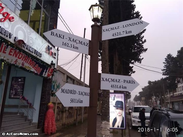Rubrika.az-ın azeuronews.com–a istinadən məlumatına görə, bu dəfə şəhərin girişinə Xaçmazdan Avropa şəhərlərinə qədər olan məsafəni göstərən istiqamət lövhələri vurulub. Xaçmazdan Madridə, Londona, Parisə və Romaya olan məsafəni göstərən lövhələr vətəndaşlar tərəfindən də birmənalı qarşılanmayıb.![]()