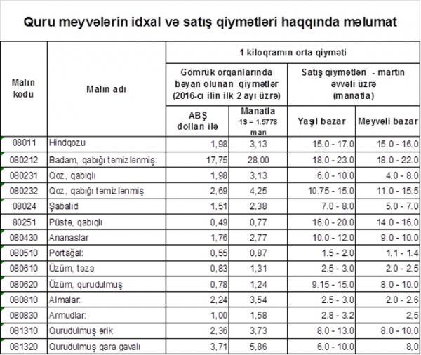 Novruz bayramı ilə əlaqədar DGK tərəfindən bu yaxınlarda araşdırma aparılıb və quru meyvələrin sahibkarlar tərəfindən bəyan edilən gömrük dəyəri və faktiki bazar qiymətləri arasında müqayisəli təhlil aparılıb. Sonuncu aparılan araşdırmalar üzrə qiymətlər aşağıdakı cədvəldə verilib:![]()