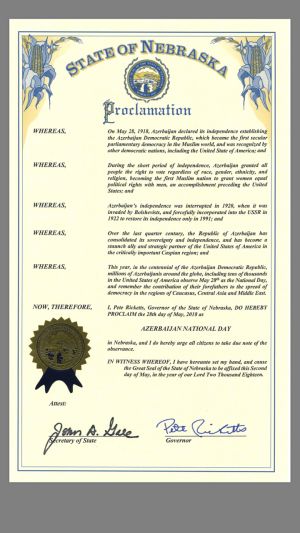 Губернатор американского штата Небраска Пит Рикетс подписал декларацию в связи со 100-летием Азербайджанской Демократической Республики, объявив 28 мая 2018 года Национальным днем Азербайджана, призвав жителей штата отметить данное событие.