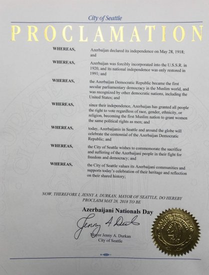 Bəyanat Sietl şəhərinin meri tərəfindən Sietlda yaşayan Azərbaycan icması və Vaşinqton Universitetinin Azərbaycanlı tələbələrinin dəstəyi nəticəsində təqdim olunmuşdur.![]()