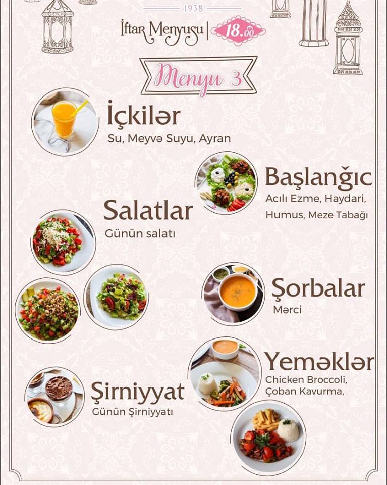 Müqayisə üçün xatırladım ki, Türkiyənin bəzi elit restoranlarının təklif etdiyi iftar menyuları isə daha ağlasığmaz qiymətədir. Məsələn, İstanbulun Çırağan bölgəsində yer alan Tuğra Restaurantın iftar menyusu adambaşına 160 manatadır.