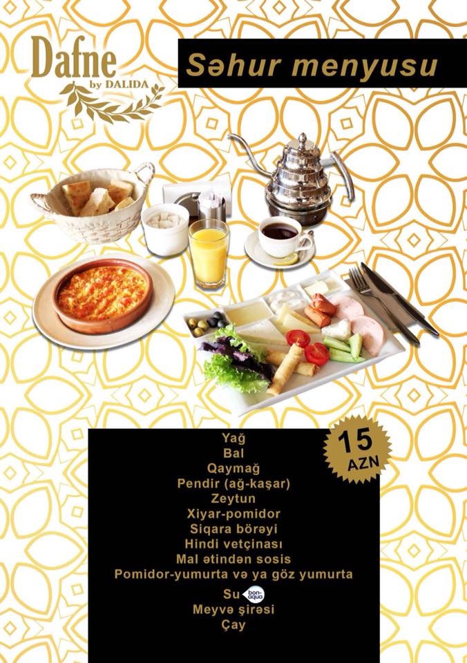 “Dafne restaurant”da sahur menyusu 15 manata təklif edilir. İftar menyusu isə 25 manatdır.![]()