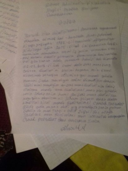 Bəlkə də sizin köməkliyiniz əsasında mənim yazdığımı kimsə oxuyub məni giov saxlayan şəxslər barəsində tədbir görsün”. Şikayətçi bildirir ki, onda bank əməkdaşı ilə yazışmaları da mövcududr və istənilən hal həmin yazışmaları da təqdim edə bilər.![]()