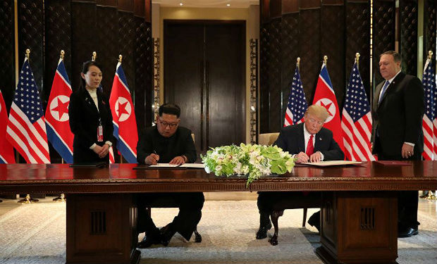İmzalama masasında ABŞ və Şimali Koreyanın bayraqları qoyulub. Kim Çen İn imzalanan sənədi tarixi sənəd adlandırıb. Onun sözlərinə əsasən, sənədin imzalanması yeni startdan xəbər verir: “Biz böyük dəyişikliklər görəcəyik”.