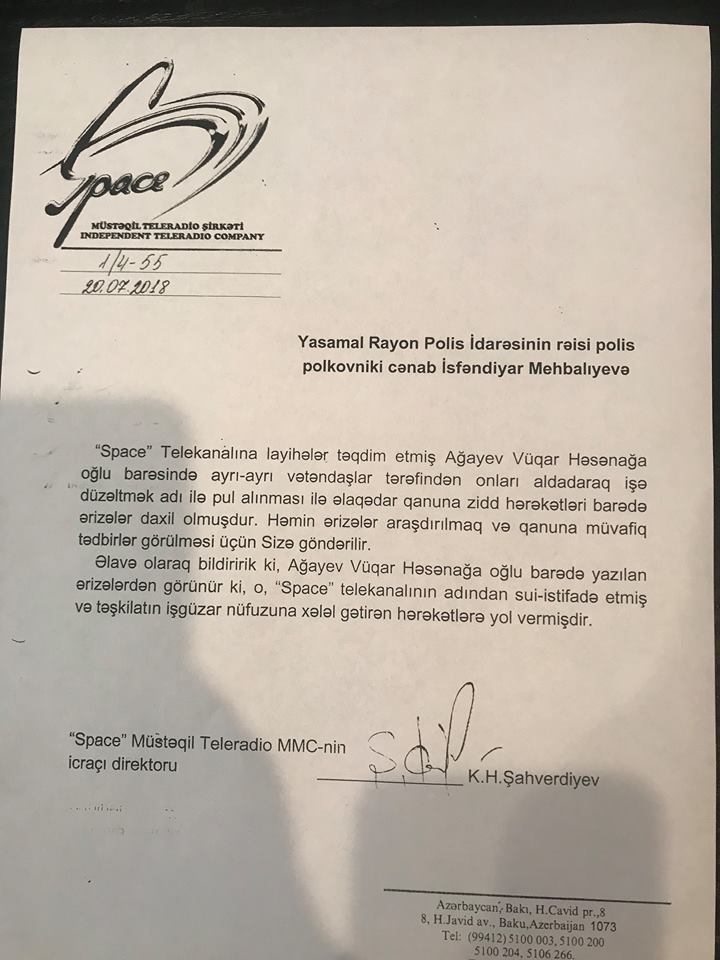 “Spase” telekanalının rəhbərliyi məsələ ilə bağlı açıqlama yayıb. Musavat.com-a verilən xəbərdə bildirilir: “Məlumat üçün bildiririk ki, əvvəlllər “Space” telekanalına layihələr təqdim edərək, müqavilə əsasında verlişlər istehsal etmiş, “Azərbaycan Media qrup” təşkilatının rəhbəri Ağayev Vüqar Həsənağa oğlunun barəsində ayrı-ayrı vətəndaşlar tərəfindən onun qanuna zidd hərəkətləri haqqında məlumatlar daxil olmağa başlamışdır. Vətəndaşların yazdığı ərizələrdən görünür ki, o “Space” telekanalının və başqa təşkilatların adından sui-istifadə edərək qanunsuz hərəkətlərə yol vermişdir. “Vətəndaşların müraciətlərinə baxılması haqqında” Azərbaycan respublikası qanununa uyğun olaraq həmən ərizələr “Space” telekanalı tərəfindən aidiyyatı üzrə hüquq-mühafizə orqanlarına göndərilmişdir. Həmən ərizəni sizə təqdim edirik.![]()