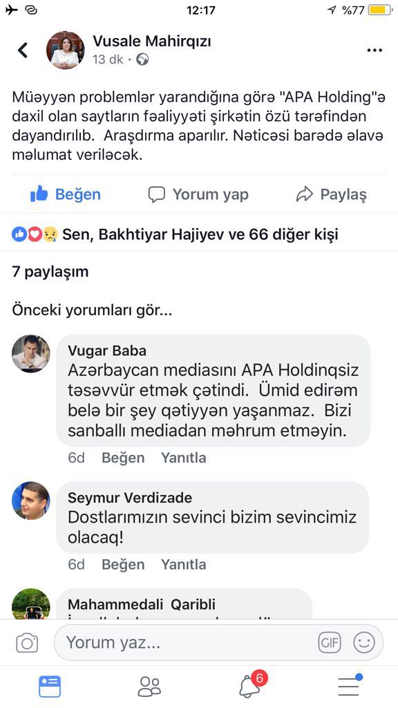 Rubrika.az musavat.com-a istinadla xəbər verir ki, özünün Facebookdakı səhifəsində o, bunları yazıb: "Müəyyən problemlər yarandığına görə "APA Holding"ə daxil olan saytların fəaliyyəti şirkətin özü tərəfindən dayandırılıb. Araşdırma aparılır. Nəticəsi barədə əlavə məlumat veriləcək."![]()