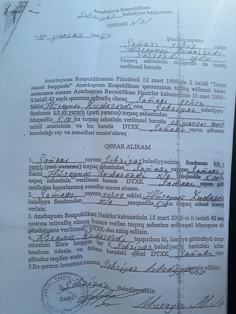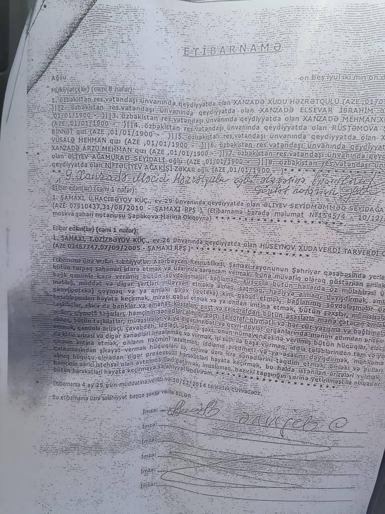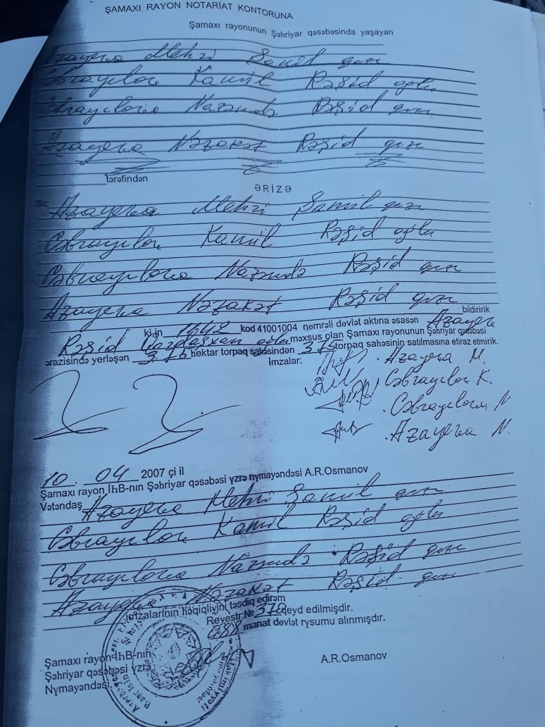 Rubrika.az saytı vasitəsilə ölkə rəhbərliyinə, hüquq mühafizə orqanlarına müraciət edən Şamaxı sakinləri torpaqların ələ keçirilməsi zamanı dəhşətli saxtakarlıqlara imza atıldığını, araşdırmalar aparılarsa daha ciddi faktların üzə çıxarılacağını bildirirlər. Şikayətçilər bildirirlər ki, “Aqro Mədrəsə” ASC-yə məxsus olan 4,27 ha torpaq sahəsi saxta yolla əvvəlcə vəfat etmiş bir şəxsin saxta etibarnaməsi ilə başqa bir vətəndaşın adına sənədləşdirilir, daha sonra həmin vəfat edən şəxsin “etibarnaməsi” ilə Araz Səbzəliyevin (yenə də Səbzəliyevlər!) adına dövr edilir. Nəhayət həmin torpaq sahəsi “Aqro Mədrəsə” ASC-nin balansına keçir. Göründüyü kimi şirkət və Səbzəliyevlər hansı vasitələrlə vətəndaşların torpaq sahələrini ələ keçirirlər.![]()