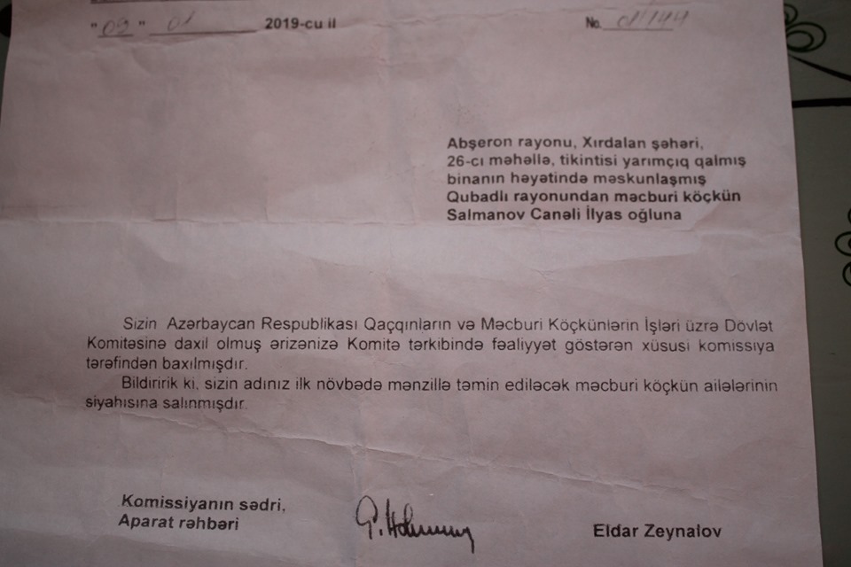 İl 2019. “Qaçqınkom” sədri R.Rzayevin fəaliyyətinin 365 günü tamamdır. Bu müddətdə nələr dəyişib – kimisi intihar qalxır, kimisi mənzil növbəsinə dura bilmir, kimisinin müraciətinə baxılmır, kimiləri də Salmanov Canəli kimi zirzəmidə zülm çəkir – uçuq bina, ilanlar böçəklər məskunlaşan nəmişli kiflənmiş divarlar, köçkünləri eşitməyən komitə…