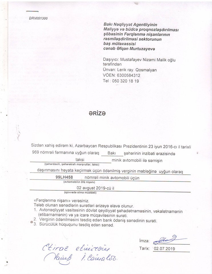 Rubrika.az 7news.az-a istinadla bildirir ki, Nizami Mustafayev Agentliyə müraciət edərək yalnız Bakı şəhərinin inzibati ərazisində taksi fəaliyyətinin həyata keçirilməsi məqsədi ilə "Fərqlənmə nişanı”nın verilməsini istəmiş və ərizəsinə də müəyyən edilən sənədləri (verginin ödənilməsini təsdiq edən bank ödəniş sənədinin, nəqliyyat vasitəsinin qeydiyyat şəhadətnaməsinin və sürücülük vəsiqəsinin surətlərini) əlavə edib. Sürücü tərəfindən sonuncu dəfə "fərqlanmə nişanı” alınmasına dair ərizə 02.07.2019 tarixində təqdim edilib.
