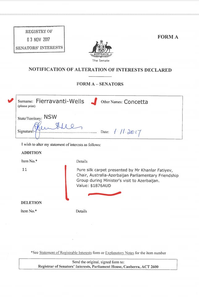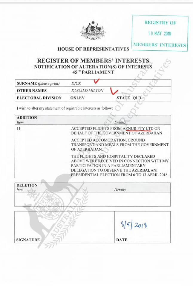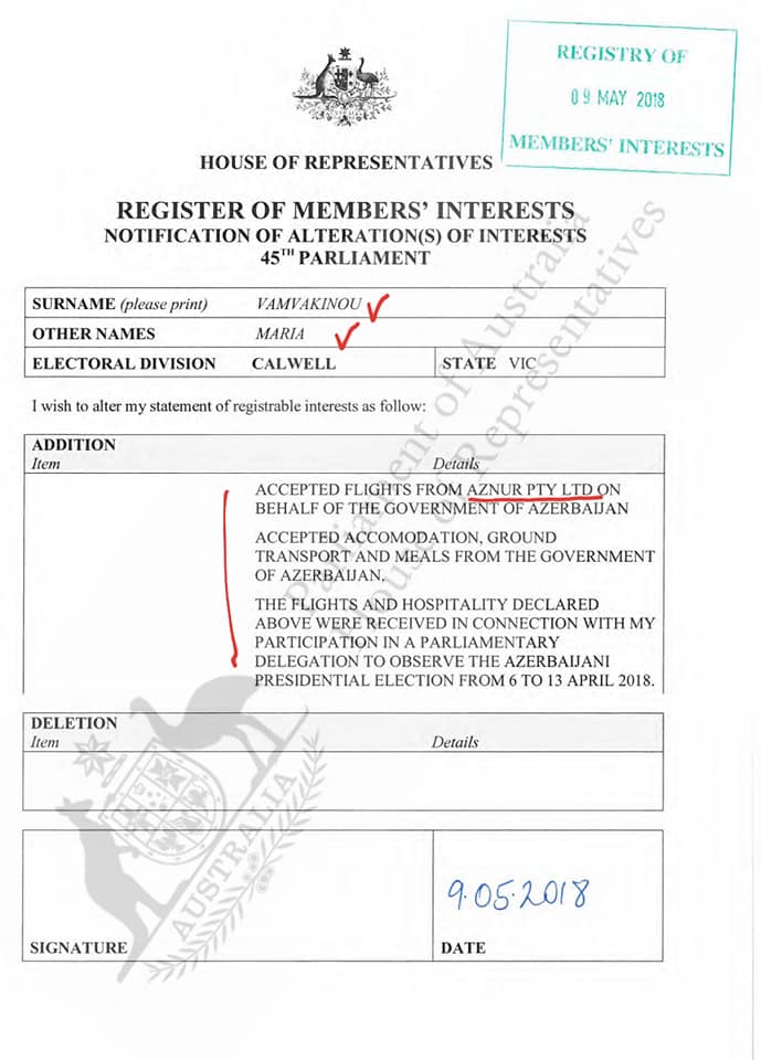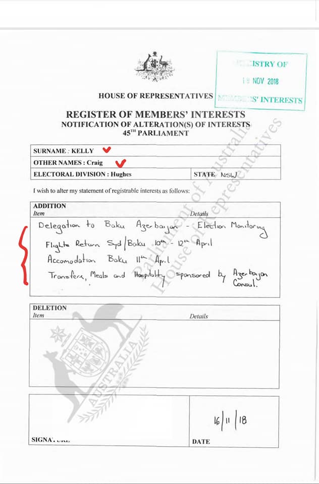 14fNümayəndələr Palatasının yekun hesabatlarına görə, Avstraliyanın 45-ci çağırış parlamentinin üzvləri Craig Kelly, Milton Dick, Maria Vamvakinou, Concetta Fierravanti-Wells və Steve Georganas 2018-ci il aprelin 6-dan 13-nə qədər Bakıda səfərdə olarkən, bütün xərclər (təyyarə biletləri, otel və yemək) Azərbaycan hökuməti adından Fətiyevə məxsus AZNUR PTY LTD tərəfindən ödənilib.
