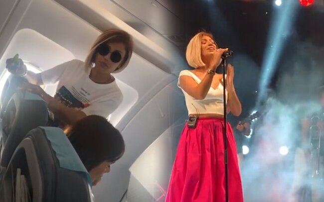 O, təyyarədə ayaq üstdə olan müğənnidən niyə oturmamasının səbəbini soruşub. Sənətçi isə "Plastik əməliyyat etdirmişəm, otura bilmirəm” deyə, əli ilə omba əməliyyatı etdirməsi barədə zarafat edib.