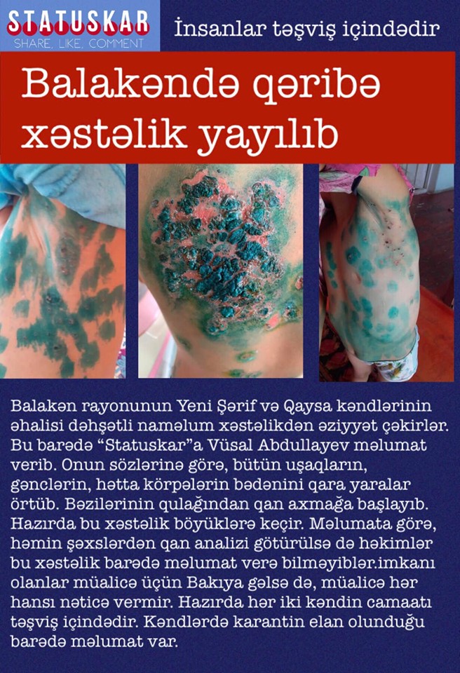 "Balakən Mərkəzi Rayon Xəstəxanasının baş həkimi Dilbər Quliyevanın Səhiyyə Nazirliyinin Mətbuat Xidmətinə verdiyi məlumata görə, adı çəkilən kəndlərin tibb məntəqələrinə hər hansı bir xəstəliklə bağlı müraciət edən olmayıb. Həmin kəndlərə yaxın ərazidə yerləşən Qabaqçöl qəsəbə xəstəxanasına da adı çəkilən kənd sakinlərindən hər hansı bir müraciət qeydə alınmayıb".![]()