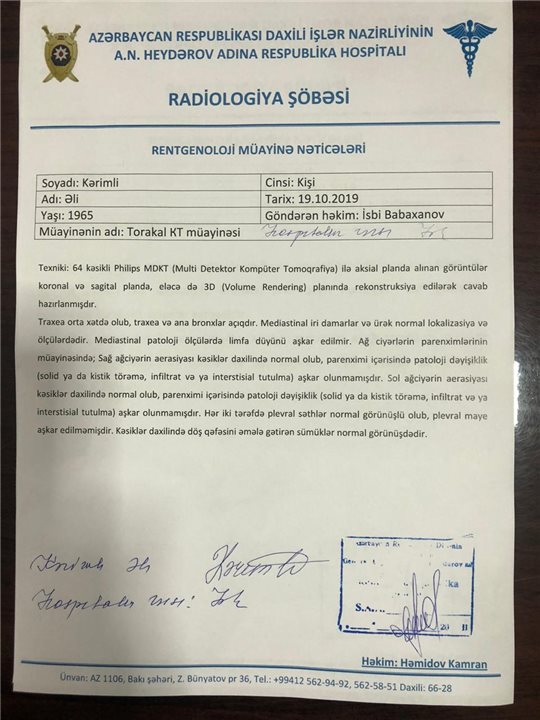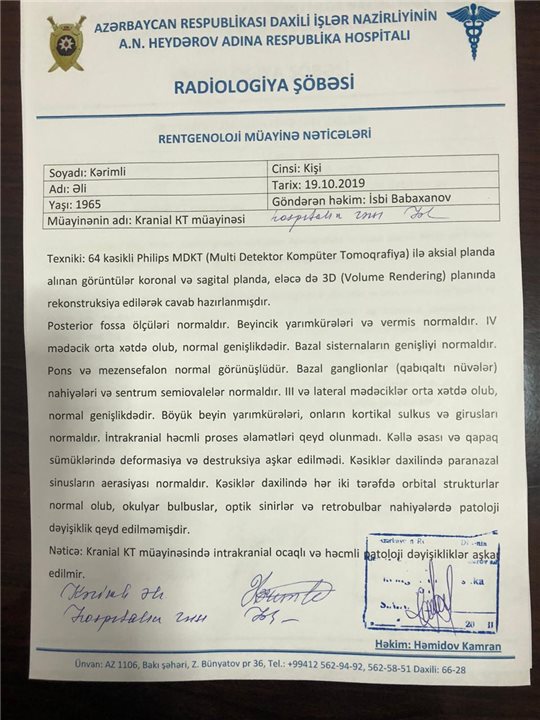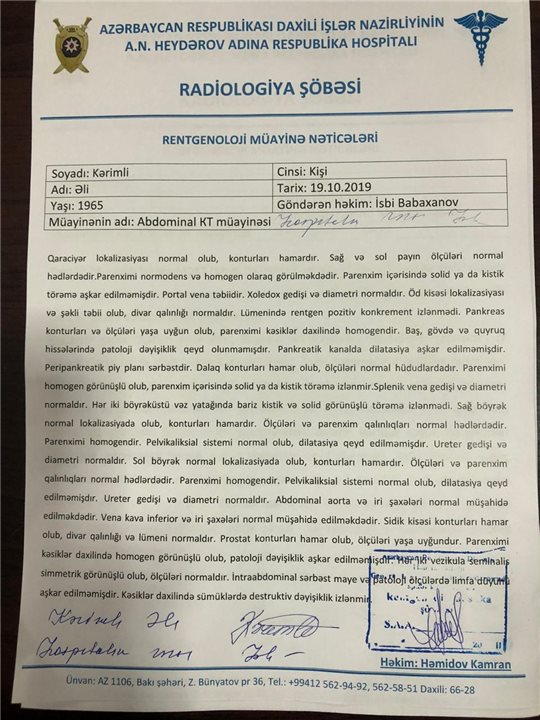 - 19 oktyabr tarixində 1965-ci il təvəllüdlü Kərimli Əli Əmirhüseyn oğlu polis əməkdaşlarının tövsiyəsi ilə hospitalda tibbi müayinələrdən keçib. Onun sol alın nahiyəsində yüngül dəri cızıqları müşahidə edilib. Vətəndaş Kərimli hospitalda baş beyin kompüter tomoqrafiyası, abdominal və torakal kompüter tomoqrafiyası, rentgenoqrafiya müayinələri və qarın boşluğunun ultrasəs müayinələrindən keçib. Heç bir patoloji hal aşkar edilməyib. Buna görə də xəstə evə buraxılmış və müayinə protokolları ona təqdim olunub.