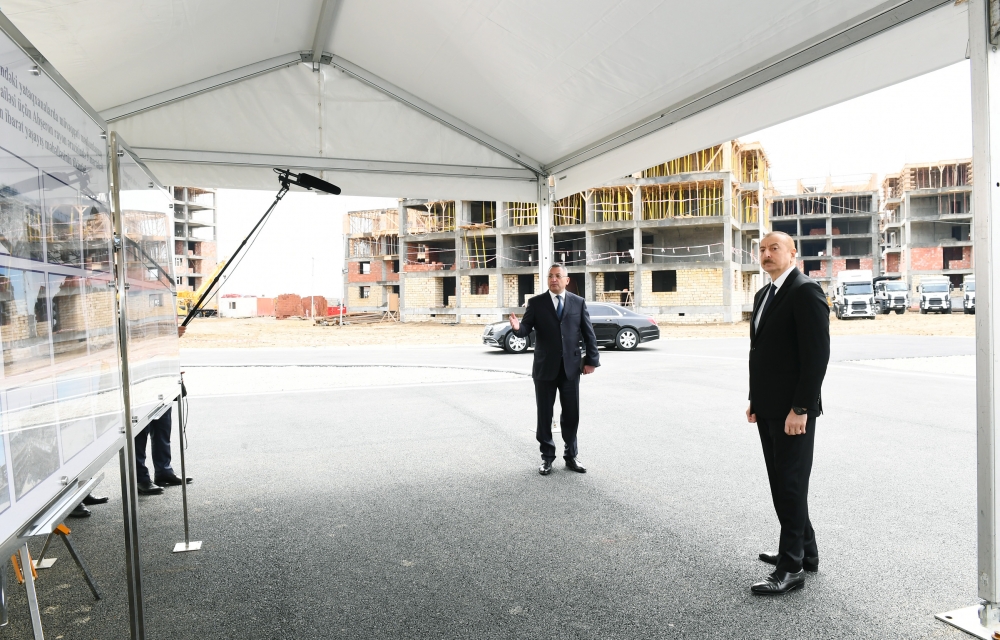 - Möhtərəm cənab Prezident, bu Sizin tapşırıqlarınıza əsasən Neft Fondundan ayrılmış vəsait hesabına Abşeron rayonunun ərazisində 1890 ailə üçün nəzərdə tutulmuş tikinti sahəsidir. Hazırda burada iki qəsəbə salınır. Qəsəbələrdən biri 1890 ailə, digəri isə 1152 ailə üçün nəzərdə tutulur. Birinci qəsəbəmizdə 1512 şagird yerlik məktəbimiz, 280 yerlik uşaq bağçamız, klub icma mərkəzimiz var və musiqi məktəbi tikilir. Digər qəsəbədə doqquzmərtəbəli 29 yaşayış binası tikilir. Bu qəsəbədə isə 35 yaşayış binası nəzərdə tutulub, hazırda tikintisi davam etdirilir. Cari ilin yanvar ayının 15-dən tikintisinə başlanılıbdır, 2200 işçi qüvvəsi cəlb olunub, müasir texnikadan istifadə edilir. Tikinti şərtləri nəzərə alınmaqla işimizi sürətlə davam etdiririk və nəzərdə tutmuşuq ki, noyabr ayının sonlarına bu qəsəbə tam hazır olacaq.