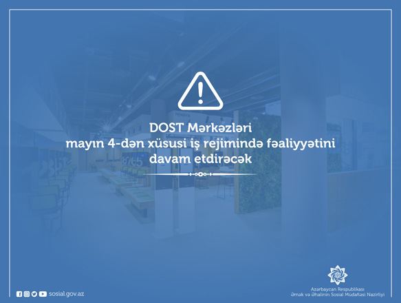 В соответствии с постановлением Оперативного штаба при Кабинете министров Азербайджана в связи со смягчением ряда ограничений, введенных в период особого режима карантина, Центры DOST с четвертого мая возобновят деятельность в связи с адресной государственной социальной помощью и предоставлением банковских карточек для получения социальных выплат