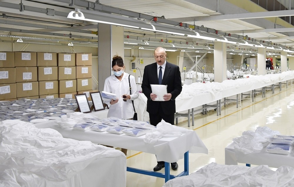Tibbi maska istehsalı Azərbaycanda ümumiyyətlə yox idi, nəzərdə də tutulmurdu. Çox sevindirici haldır ki, özəl sektor böyük sosial təşəbbüs göstərərək, dövlətin çağırışına cavab verərək qısa müddət ərzində bizim üçün lazım olan – həm həkimlər, həm də adi vətəndaşlar üçün lazım olan bu vasitələri istehsal etməyə başlamışdır. Bu gün bu müəssisədə fəaliyyətə başlamış tibbi maska fabriki ölkəmizdə ikinci istehsalat sahəsidir. Birinci müəssisə də Sumqayıt şəhərində yerləşir, Sumqayıt Kimya Sənaye Parkının ərazisində. Əlbəttə ki, əgər bizim inkişaf etmiş müasir sənaye potensialımız olmasaydı, bu istehsalat sahələrini yaratmaq mümkün olmazdı. Məhz sənayeləşmə siyasəti nəticəsində və xüsusilə Sumqayıt şəhərində yeni müasir sənaye müəssisələrinin fəaliyyətə başlaması nəticəsində qısa müddət ərzində fabriklər öz profilini dəyişdirərək, artıq tibbi maskaları və qoruyucu kombinezonları istehsal etməyə başlamışdır.