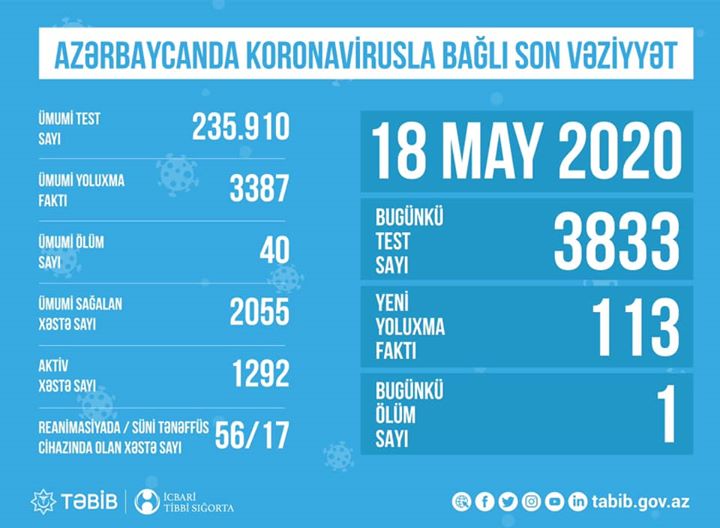 Xatırladaq ki, bu günə qədər ölkəmizdə 3387 koronavirusa yoluxub. 40 nəfər ölüb, 2055-i isə sağalıb. Hazırda 1292 nəfər aktiv xəstə kimi qeydiyyatdadır.
