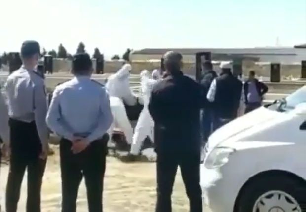 Videoda xüsusi geyimli şəxslərin cənazəni qəbirə qoyması, prosesə polislər tərəfindən nəzarət olunması görünür.