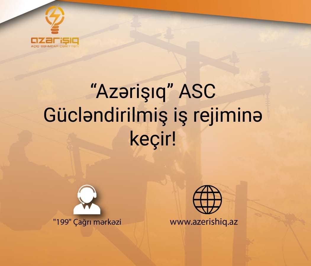 "Azərişıq" əməkdaşları koronavirus (COVID-19) pandemiyası ilə əlaqədar karantin rejimi tətbiq edildiyi vaxtdan gücləndirilmiş iş rejimində çalışır. Bu günlərdə də istehlakçıların dayanıqlı və keyfiyyətli elektrik enerjisi ilə təmin olunması üçün Qəza xidmətləri minimum işçi sayı ilə öz vəzifələrini icra edəcəklər. Abonentlərimizdən xahiş edirik ki, hər hansı bir qəza halı yaranarsa, 24 saat fasiləsiz fəaliyyət göstərən 199 Çağrı mərkəzi ilə əlaqə saxlasınlar”.