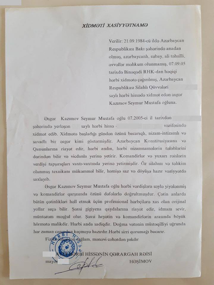 Hərbi xidməti başa vurduğum gün qərargaha getdim ki, sağollaşam. Bayırda gözləməyi tapşırdı. 10 dəqiqədən sonra əlində bu xidməti xasiyyətnamə ilə gəldi və mənə uzatdı. Gözucu baxdım, təşəkkür etdim. İstədim əlini sıxam, amma bacarmadım, zabit zəhmi gözlərində idi. Hərbi salam verdim, o da jestimə qarşılıq verdi. Əsgər və zabit kimi sağollaşdıq. Bir daha görüşmədik.