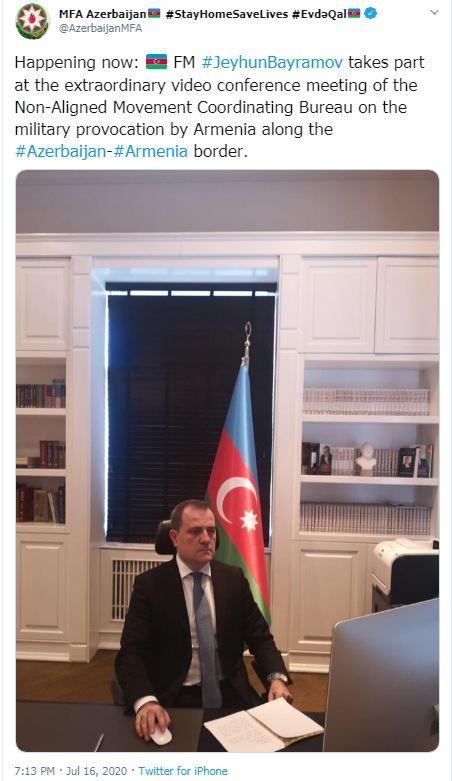 Qoşulmama Hərəkatının Koordinasiya Bürosunun Ermənistanın Azərbaycanla sərhəd boyu hərbi təxribatına dair fövqəladə videokonfransı keçirilir.