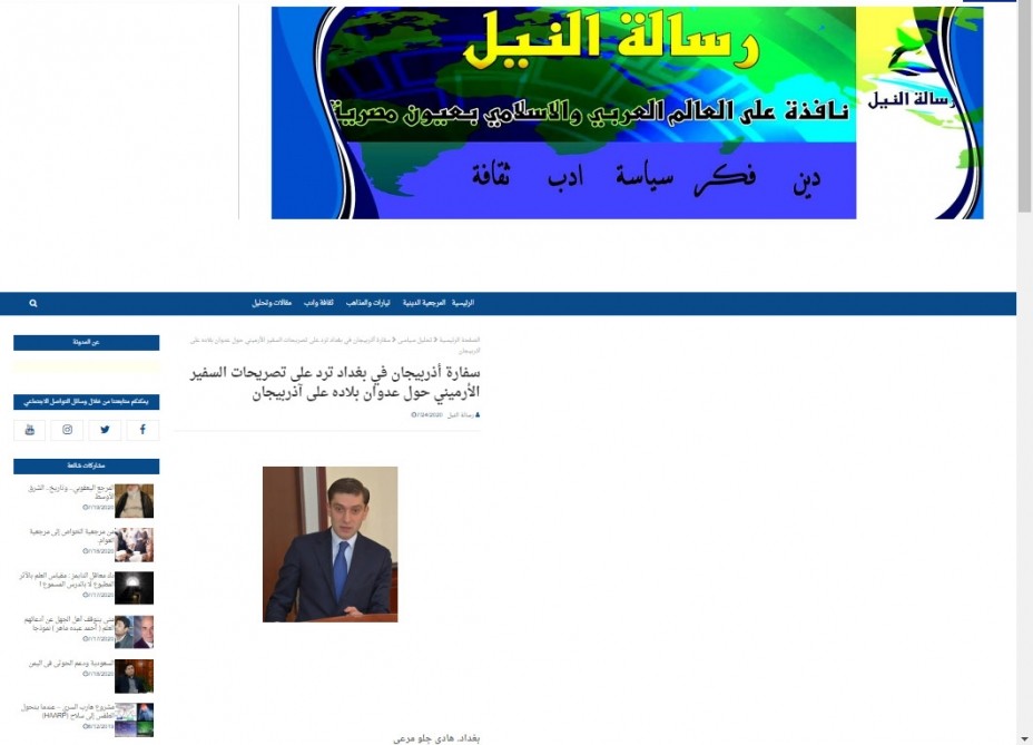 İyulun 19-da isə Ermənistanın İraqdakı səfiri tərəfindən “Azzaman” sayt və qəzetində heç bir məntiqə əsaslanmayan, yanlış fikirlərdən ibarət məqalə dərc edilib. Buna cavab olaraq Azərbaycanın İraqdakı səfirliyi bir neçə KİV-də sübutlara əsaslanan bəzi real məqamları bir daha İraq xalqının diqqətinə çatdırıb. İraqın “alrased.news”, “iraqi-lens”, “sowt-raf.blogspot.com, sindibadnews.com, ashourland.net və nilemessage.blogspot.com internet resursları Azərbaycanın İraqdakı müvəqqəti işlər vəkili Nəsir Məmmədovun təqdim etdiyi materiallara əsasən “Ermənilərə layiqli cavab verildi” başlıqlı məqalə dərc olunub.