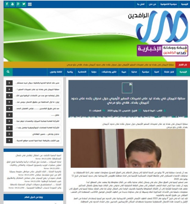 Rubrika.Az xəbər verir ki, iyulun 18-də Azərbaycanın səfirliyi tərəfindən İraqın kütləvi informasiya vasitələrinə (KİV) Ermənistanın iyulun 12-də Azərbaycanın Tovuz rayonu istiqamətində hərbi təcavüz cəhdi barədə sübutlara əsaslanmış məlumat təqdim olunub.