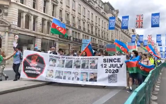 Diasporla İş üzrə Dövlət Komitəsindən Rubrika.Az-a verilən məlumata görə, Britaniyada yaşayan azərbaycanlıların Ermənistan silahlı qüvvələrinin hərbi təxribatlarına və işğalçı siyasətinə etiraz məqsədilə təşkil etdikləri yürüş-mitinq BBC-nin binası qarşısından başlayıb. Türk icması üzvlərinin də qatıldıqları aksiyada Azərbaycan və Türkiyənin dövlət bayraqları dalğalandırılıb, Ermənistanın hərbi təxribatları nəticəsində həlak olan şəhidlərimizin şəkilləri, müxtəlif şüarların yazıldığı plakat və bannerlər nümayiş etdirilib. Əraziyə gələn bir qrup erməni təxribata cəhd etsə də, London polisinin müdaxiləsi nəticəsində heç bir insident baş verməyib.