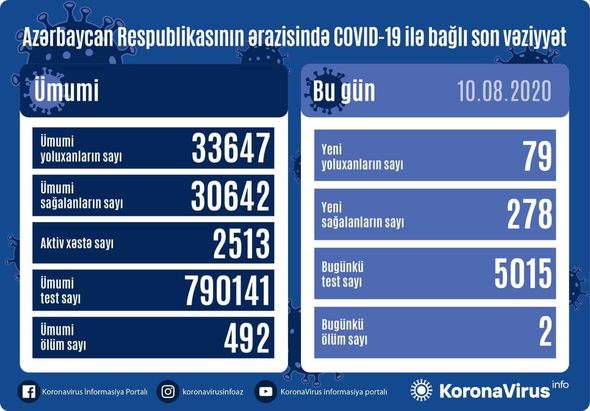 Azərbaycanda koronavirus infeksiyasına 79 yeni yoluxma faktı qeydə alınıb, 278 nəfər müalicə olunaraq sağalıb və evə buraxılıb.