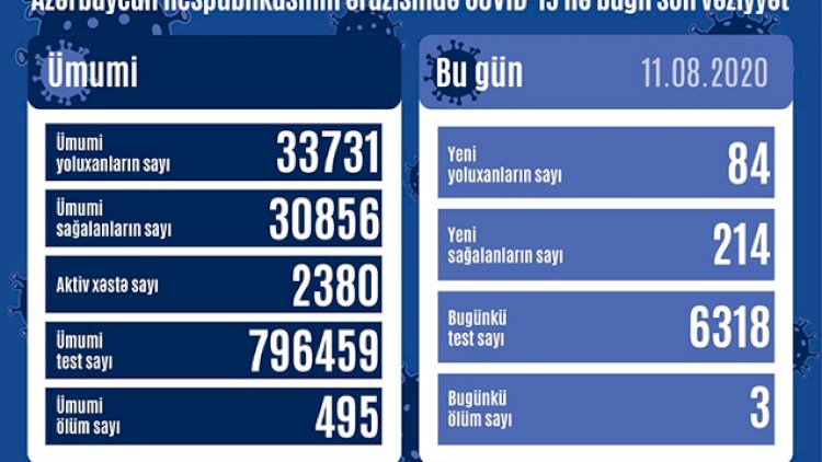 Azərbaycanda yeni koronavirus infeksiyasına 84 yoluxma faktı qeydə alınıb, 214 nəfər müalicə olunaraq sağalıb və evə buraxılıb.
