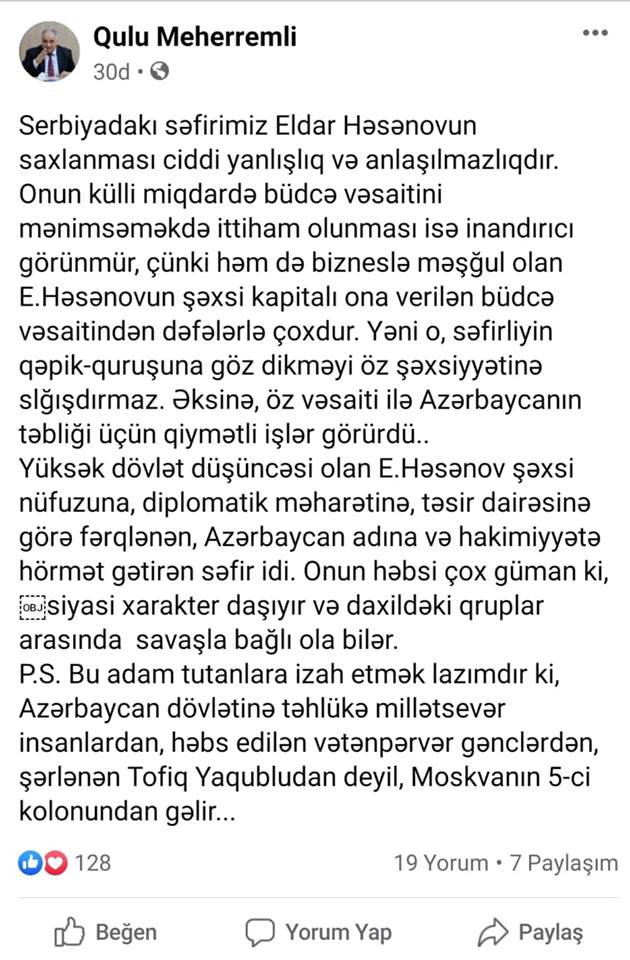 E.Həsənovun həbsindən sonra onu açıq şəkildə müdafiə edən şəxslər də oldu. Açığı, bir sıra şəxslərin E.Həsənovu müdafiə etməsi xeyli maraqlı suallar doğurur. Məsələn, professor Qulu Məhərrəmli özünün Facebook hesabında yazır: “Serbiyadakı səfirimiz Eldar Həsənovun saxlanması ciddi səhv və anlaşılmazlıq idi”.