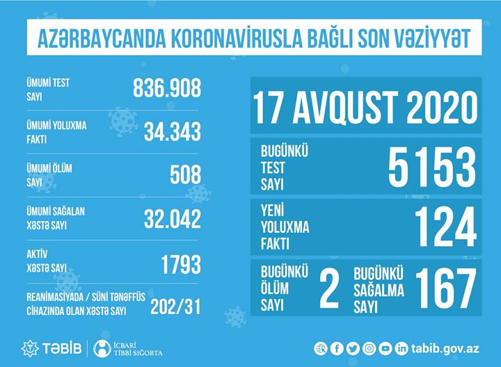 Tibbi Ərazi Bölmələrinin İdarəetmə Birliyindən (TƏBİB) verilən məlumata görə, bu gün 5153 koronavirus testi edilib. Onlardan 124-ü pozitiv çıxıb. Bununla da ölkə ərazisində indiyə qədər edilən koronavirus testlərinin sayı 836 908-ə çatıb.