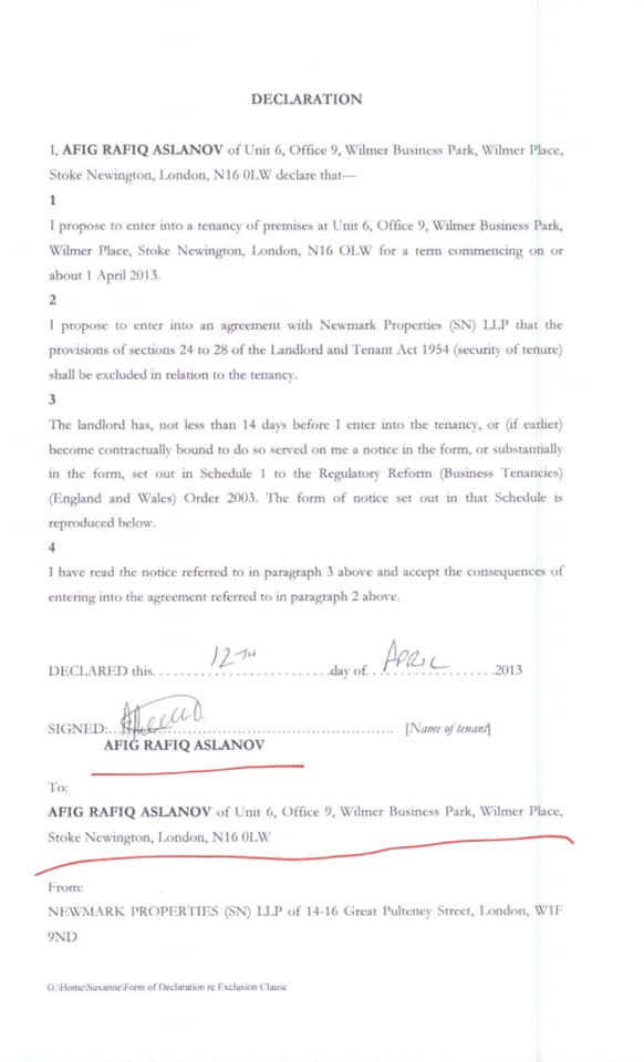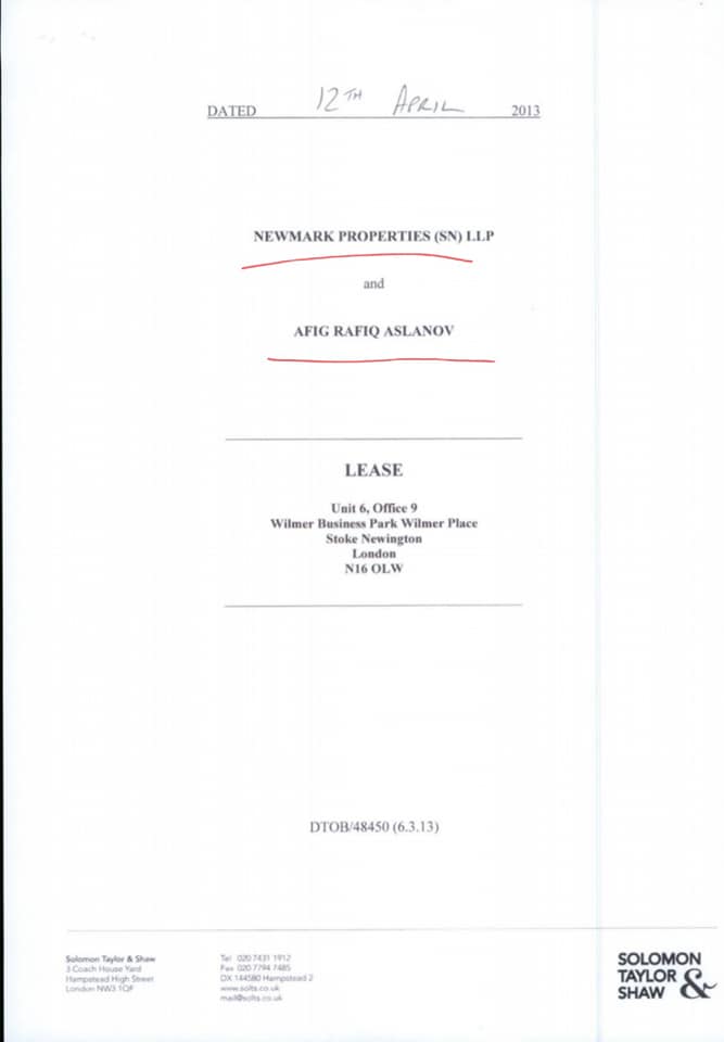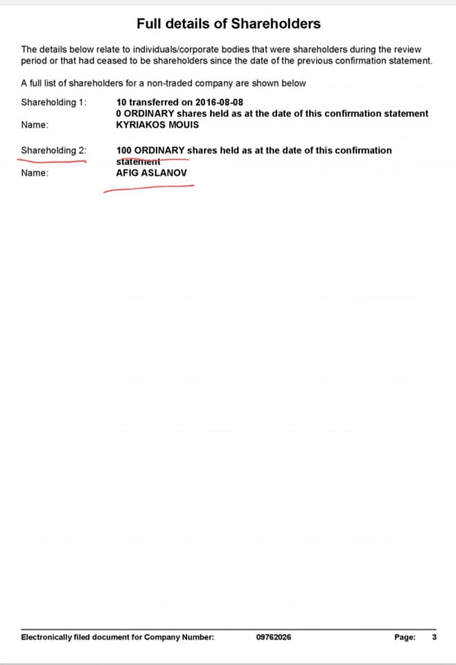 Sənədlərə görə 2018-ci ilin sentyabrın 6-da Afiq Aslanov bu şirkət üzərindən Londondakı Octane Property Finance Limited şirkəti ilə daşınmaz əmlak alışı ilə bağlı 1135 8112 0001 saylı müqavilə bağlayıb”.![]()