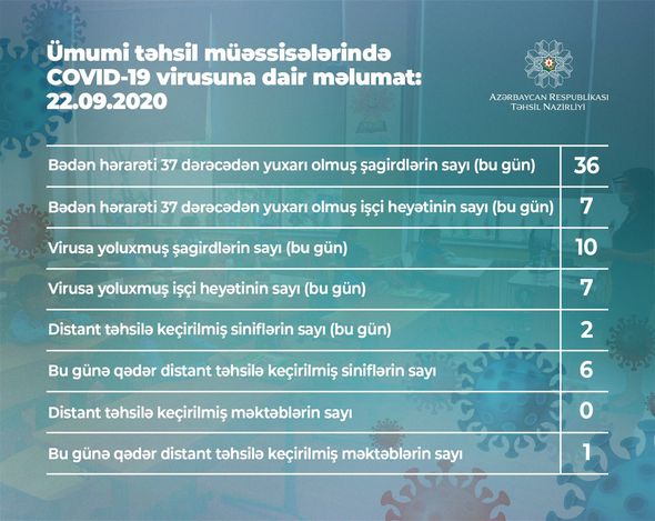 Rubrika.Az xəbər verir ki, məlumata görə, sentyabrın 22-də 36 şagirddə hərarət 37 dərəcədən yüksək olub.