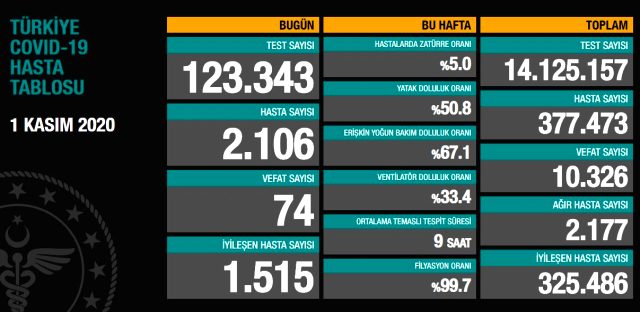 Türkiyədə son sutka ərzində koronavirusdan 74 nəfər dünyasını dəyişib, 2106 nəfər isə virusa yoluxub.
