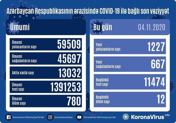 Ümumi yoluxanların sayı 59509 nəfər, ümumi sağalanların sayı 45697 nəfərdir.
