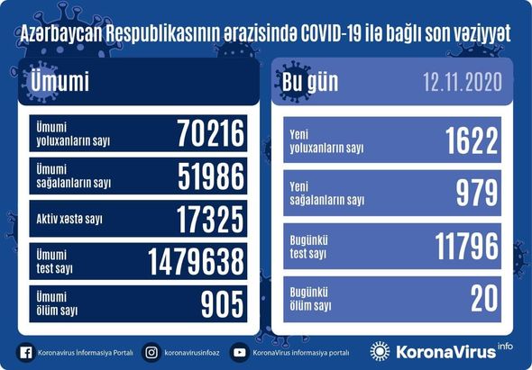 Ümumi yoluxanların sayı 70216 nəfər, ümumi sağalanların sayı 51986 nəfərdir.