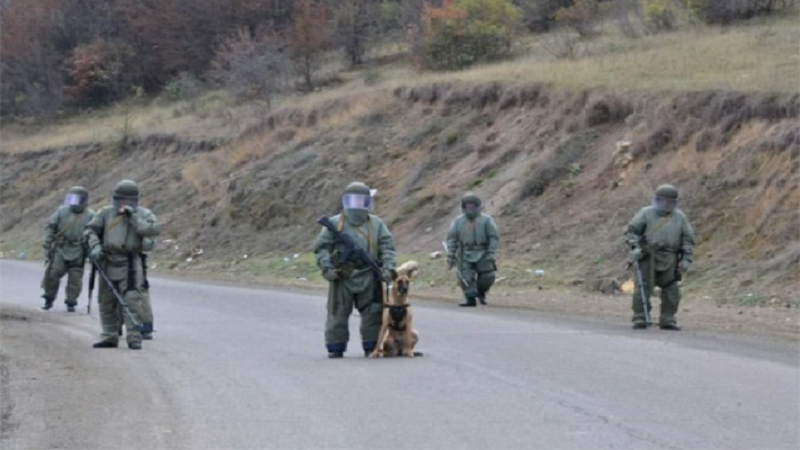 Rusiya Müdafiə Nazirliyinin Beynəlxalq Ərazilərin Minalardan Təmizlənməsi Mərkəzinin hərbçilərinin xüsusi təlim keçmiş itlərlə birlikdə Dağlıq Qarabağı minadan təmizləmə əməliyyatının görüntüləri yayılıb.