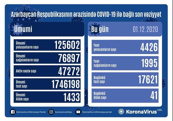 Ümumi yoluxanların sayı 125602 nəfər, ümumi sağalanların sayı 76897 nəfərdir.