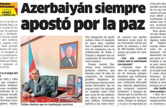 Perunun nüfuzlu “Diario UNO” qəzetində Ermənistanın Azərbaycana qarşı təcavüzünün tarixi və atəşkəs bəyanatı haqda bu ölkədəki səfirimiz Məmməd Talıbovun “Azərbaycan hər zaman sülh tərəfdarı olub” başlıqlı müsahibəsi dərc olunub.